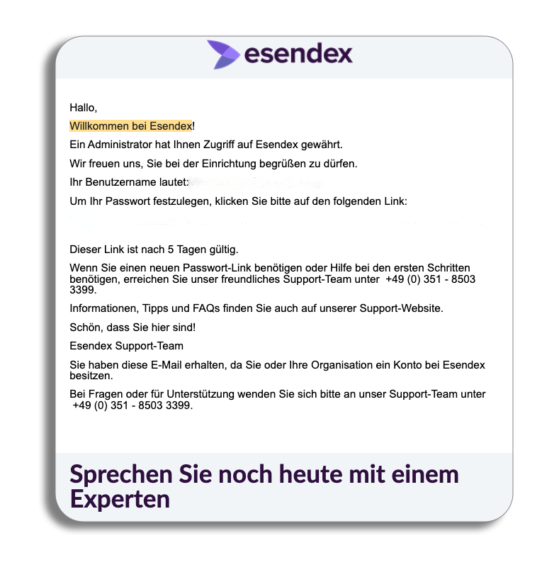Sobald Ihr Profil auf der Esendex-Plattform erstellt wurde, erhalten Sie automatisch eine E-Mail, in der Sie Ihr Passwort festlegen können. Diese enthält Ihren Benutzernamen (Ihre E-Mail-Adresse) und einen Link zur Passwortfestlegung. Klicken Sie auf den Link in der E-Mail, um fortzufahren.